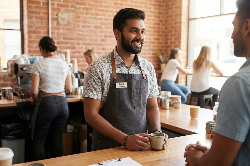 Modern café staff uniforms featuring relaxed styling and functional design, delivering comfort and a welcoming look for casual dining environments.