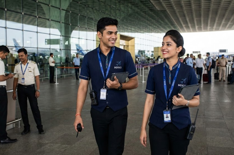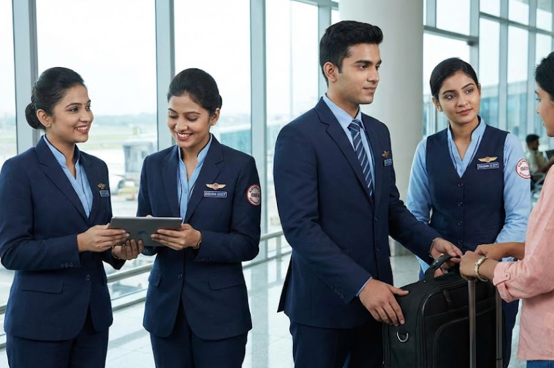 Customer service ground uniforms designed for approachability and professionalism, featuring neat tailoring and comfort for extended airport duty hours.