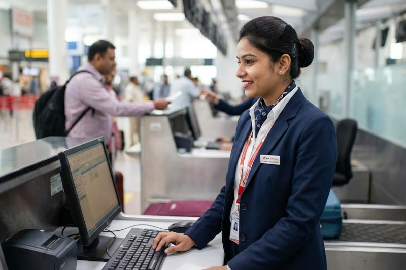 Smart check-in staff uniforms crafted for front-facing roles, offering polished styling, comfort, and consistent brand representation at airport counters.