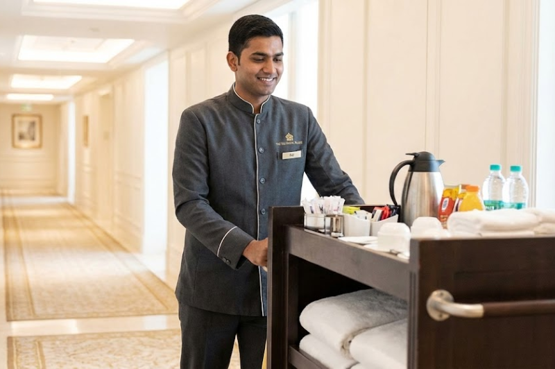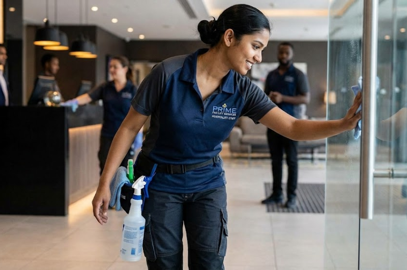 Functional cleaning staff uniforms designed with breathable fabrics and ergonomic fits, supporting efficient work while maintaining professional hospitality standards.