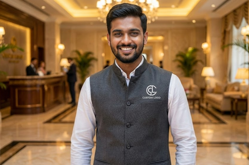 Custom logo waistcoats designed to reflect brand identity, offering consistent styling, comfort, and high-quality finishing for event service staff.