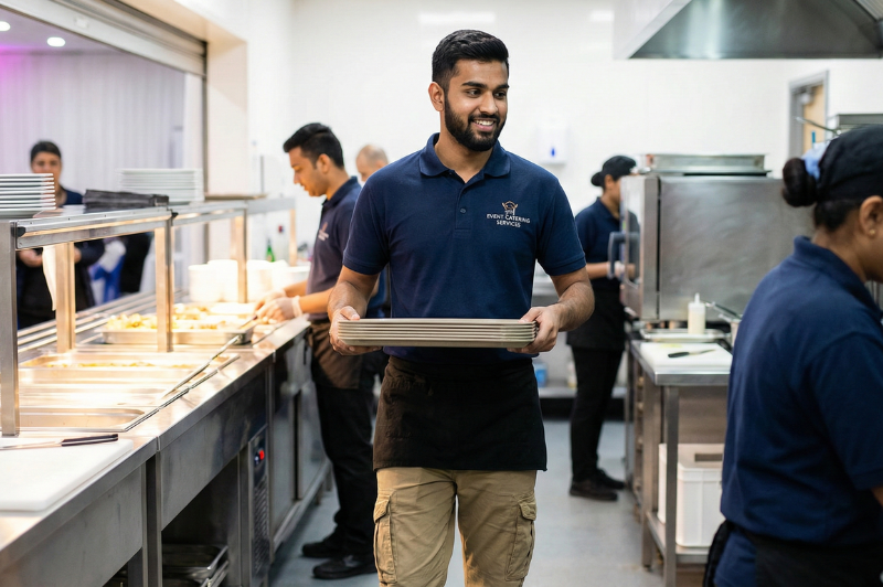 Catering support uniforms crafted for efficiency and movement, ensuring comfort, durability, and a neat professional look for event operations.